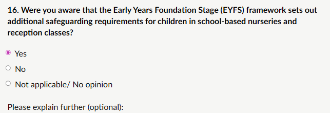 My response: “Yes, I was aware that the Early Years Foundation Stage (EYFS) framework sets out additional safeguarding requirements for children in school-based nurseries and reception classes (ages 0–5). The EYFS Statutory Framework (current version 2024/2025) includes a dedicated safeguarding and welfare section (Section 3), which imposes specific duties beyond general KCSIE. To avoid overload, the DfE could consider a dedicated one-page cross-reference summary of key EYFS-KCSIE alignments for reception staff, similar to the proposed Part one summary. This would aid compliance without adding length to the main document.”