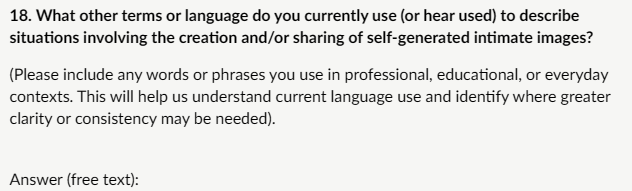 Proposal and rationale: KCSIE currently uses the terminology “Consensual and non-consensual sharing of nude and semi-nude images and/or videos (also known as sexting or youth produced sexual imagery)”. Following stakeholder feedback, we propose to change this language to “consensual and non-consensual self-generated intimate images and/or videos including those generated using AI e.g. deepfakes”. This change in language aims to improve clarity, consistency with current safeguarding terminology, and better reflect the seriousness of both consensual and non-consensual image sharing.