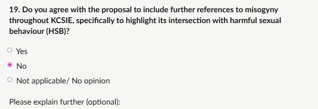 My response: “I do not agree with adding further references to misogyny throughout KCSIE without balancing it with discussions of misandry adopting a more neutral approach to harmful sexual behaviour (HSB). While evidence shows misogyny is prevalent online and linked to HSB, 90% of girls vs 50% of boys experience unwanted explicit images, focusing solely on misogyny risks a one-sided narrative that alienates boys and frames them as inherent perpetrators. This could exacerbate male disenfranchisement, as critics argue anti-misogyny lessons are “silly gimmicks” that stigmatise boys without addressing root causes like societal rewards for feminine traits over masculine ones. Teaching teenagers, I have to agree with the critics, there are far better ways to deal with this issue: Emphasise mutual respect, kindness in relationships, and challenging all prejudice (including misandry) via RSHE’s focus on positive role models for both sexes. Teach about harmful narratives without blame to avoid division and promote true safeguarding for everyone. If misogyny is highlighted, misandry must be too for equity under the Equality Act.”