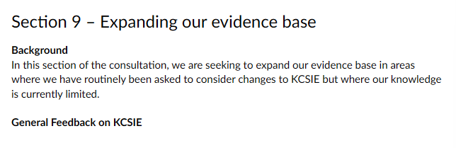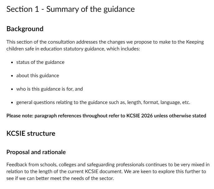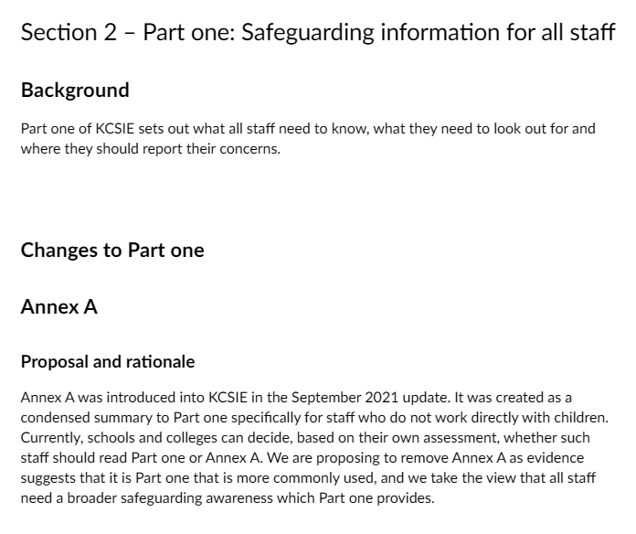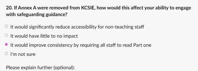 My response: “Removing Annex A would improve consistency and strengthen overall safeguarding awareness across the entire school or college workforce. Part one is already the core, concise summary of essential safeguarding knowledge that every member of staff—teaching and non-teaching—must read and understand annually. It is deliberately written to be accessible (currently around 10–12 pages in the 2025 version), covering key signs of abuse, what to do if a concern arises, the child-centred approach, and basic responsibilities without overwhelming detail. Requiring everyone to read the same Part one document would: Promote a unified safeguarding ethos where all adults in the setting understand their shared responsibility. Reduce confusion over which version to use and simplify annual training/induction processes. Align with the principle that safeguarding is everyone’s responsibility, not just those in direct child-facing roles. Overall, removing Annex A would be a positive step toward higher standards, greater consistency, and better protection for children by ensuring no staff member has a diluted version of the essential guidance.”