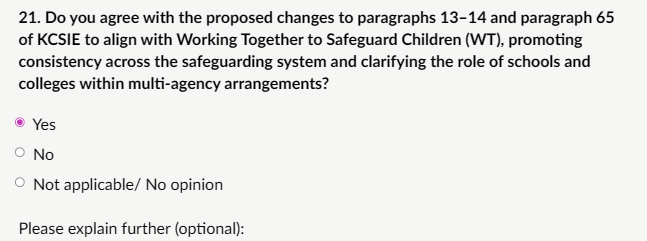My response: “I agree with the proposed changes to paragraphs 13–14 and paragraph 65 to better align KCSIE with Working Together to Safeguard Children (WTSC 2023). This promotes much-needed consistency across the multi-agency safeguarding system and clarifies the specific role of schools and colleges within those arrangements to :Reinforce that safeguarding is a shared, multi-agency responsibility (as per WTSC Chapter 2), where schools contribute actively to local safeguarding partnerships (LSPs), early help, child protection enquiries, and information sharing. Update paragraph 65 to explicitly require governing bodies/proprietors to ensure the school/college contributes to multi-agency working in line with WTSC, including engaging with LSPs, relevant agencies, and processes like strategy discussions or child protection conferences. Clarify paragraphs 13–14 (likely in the “Safeguarding information for all staff” or early help sections) to reflect WTSC’s emphasis on schools’ pivotal role as often the first point of contact for concerns, their duty to provide early help where appropriate, and integration into the broader system of help, support, and protection.”