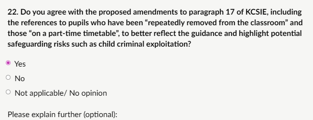 My response: “I agree with the proposed amendments to paragraph 17 of KCSIE 2026, which add references to pupils who have been “repeatedly removed from the classroom” and those “on a part-time timetable” as factors that may indicate a need for early help. These changes better reflect the DfE’s Behaviour in Schools guidance (February 2024 version) and highlight genuine safeguarding risks, particularly child criminal exploitation (CCE), including county lines involvement. Repeated removals can signal underlying issues like disengagement, unmet needs (e.g., SEND), or escalating vulnerability. Linking this to early help in KCSIE is appropriate, as persistent removal may indicate risks such as poor attendance patterns, mental health concerns, or exposure to exploitation outside school. It aligns with the guidance’s emphasis on proportionate, transparent use of removal and reintegration processes to avoid alienation. Official DfE-aligned local authority guidance states pupils of compulsory school age are entitled to full-time education, and part-time timetables should be exceptional, time-limited (often max 6 weeks), consensual, and not used for behaviour management.”