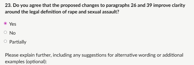 My response: “I agree that the proposed changes to paragraphs 26 and 39 improve clarity around the legal definition of rape and sexual assault under the Sexual Offences Act 2003 (section 1), which defines rape precisely as intentional penetration of the vagina, anus, or mouth with a penis, without consent and without reasonable belief in consent. The current wording in KCSIE (e.g., 2025 version, paragraph 27 on sexual abuse and paragraph 33 on child-on-child abuse) includes phrases like “assault by penetration (for example rape or oral sex)” or “sexual violence such as rape, assault by penetration and sexual assault.” This can create confusion because: Non-consensual oral penetration by a penis is rape under section 1—so listing “rape or oral sex” separately risks implying that oral rape is not “real” rape or is a lesser/different offence. Accurate terminology supports better safeguarding, especially in child sexual exploitation (CSE) or child-on-child cases where precise recognition of offences is vital for risk assessment and response.”