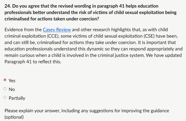 My response: “I agree that the revised wording in paragraph 41 helps education professionals better understand the risk of victims of child sexual exploitation (CSE) being criminalised for actions taken under coercion. The update reflects evidence from the Baroness Casey National Audit on Group-based Child Sexual Exploitation and Abuse (June 2025), which highlighted how victims—often groomed and coerced—have been treated as perpetrators rather than protected, including through criminal convictions for offences committed under duress (e.g., drug-related activities, theft, or prostitution offences forced by exploiters). The report notes victims living with the “constant shadow” of injustice, stigma, and unaddressed convictions, exacerbating trauma and distrust in authorities. Suggestions: Add a brief cross-reference to the Casey Audit key findings, Include practical prompts for DSLs: “When a child is involved in offending, consider CSE/CCE indicators and refer to multi-agency partners before assuming criminality.” Emphasise support for victims with historic convictions, linking to government review processes. Ensure wording avoids normalising coercion—frame it clearly as abuse, not “choice.” “
