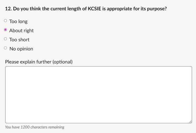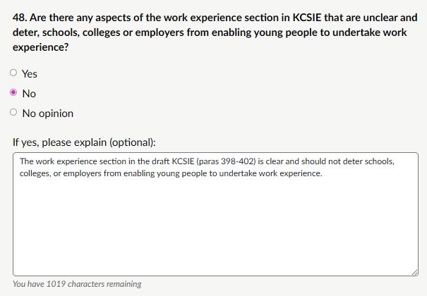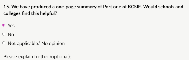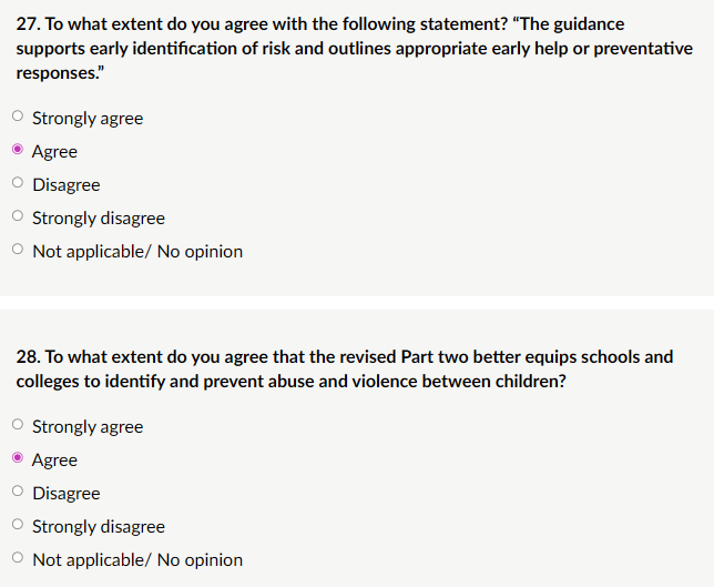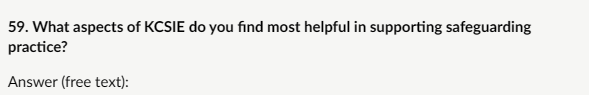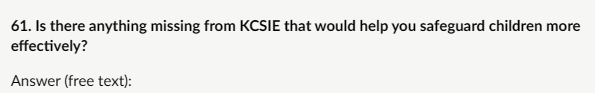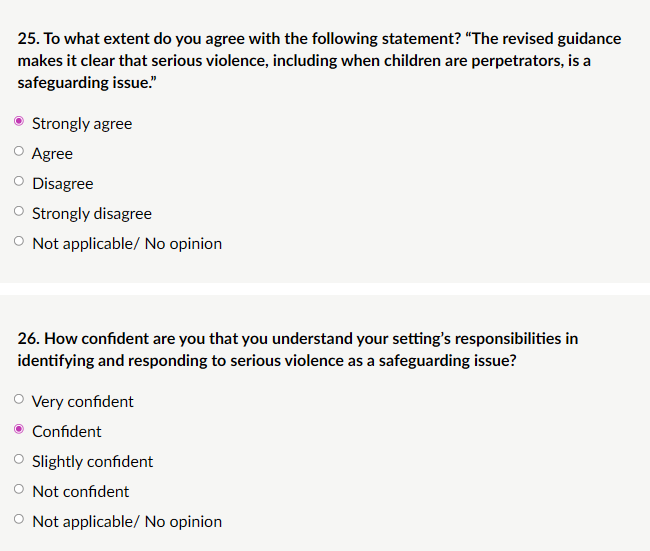 My response: “Checklists, Clearer definitions, Partner roles: checklists would be most helpful for quick reference in identifying risk indicators (e.g., escalation from verbal threats to weapon-carrying, peer group dynamics, unexplained injuries, changes in behaviour). Clearer definitions are also needed to distinguish serious violence (requiring immediate safeguarding/police response) from lower-level conflict, avoiding over- or under-reaction. Partner roles (e.g., police under Serious Violence Duty, youth offending services, children’s social care, early help teams) would clarify multi-agency pathways and prevent silos. These additions would keep KCSIE practical and focused without excessive length, supporting consistent, trauma-informed responses across schools and colleges.”