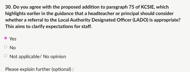 My response: “This is a helpful and necessary clarification for the following reasons: Timely and consistent decision-making. Reinforces statutory expectations: Under Working Together to Safeguard Children (2023) and KCSIE itself (paragraphs 391–418 in current versions), headteachers/principals must consider LADO referral, explicitly signposting this duty earlier reduces the risk of concerns being managed informally or internally without LADO consultation, which has been a factor in serious case reviews (e.g., where grooming or abuse was missed due to delayed external oversight).