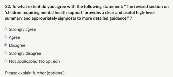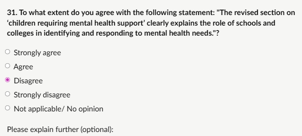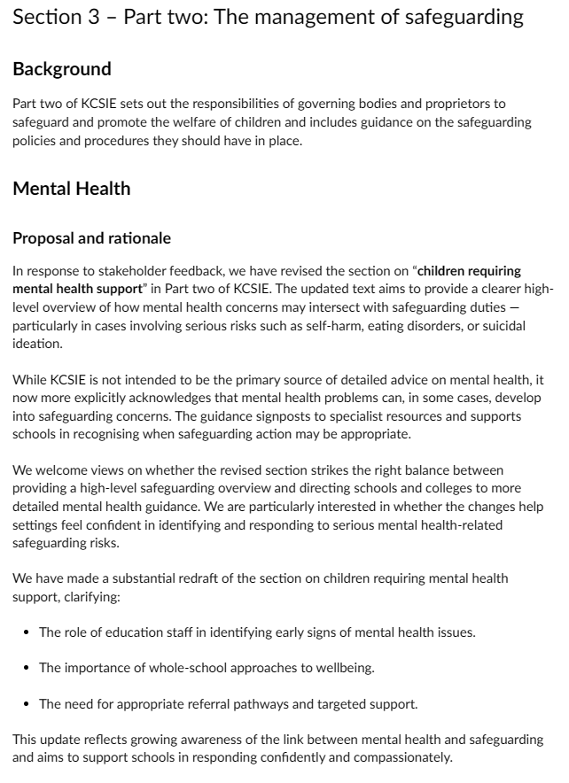 My response: “I disagree that the revised section provides a clear and useful high-level summary or appropriately signposts to more detailed guidance. While the intent to clarify intersections between mental health and safeguarding is understandable, the redraft still risks over-extending schools’ role into mental health territory. Teachers and non-specialist staff are not equipped or qualified to identify early signs of issues like eating disorders, self-harm, or suicidal ideation in a diagnostic sense, nor should they be encouraged to provide “targeted support” beyond immediate safety measures and referral.