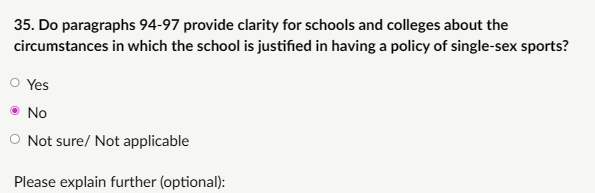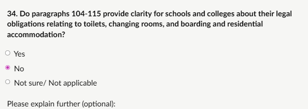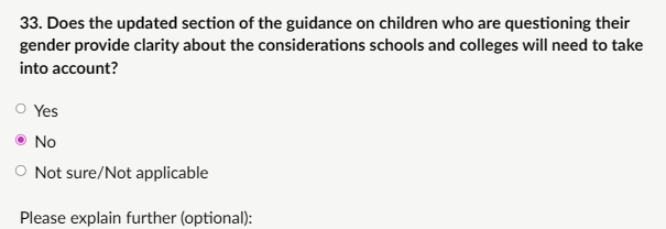My response: “The most challenging, problematic and least helpful aspect is any allowance for social transition (name/pronoun changes, even case-by-case; paras 251–268). This contradicts biological sex immutability, risks deceiving children/peers about unchangeable reality, and normalises a dangerous ideology. Cass Review (2024) views social transition as an active intervention with unknown long-term effects, limited evidence of benefits, and higher medical pathway risks pre-puberty. It can intensify distress, lead to “stealth” living, and misattribute trauma/neurodiversity as gender issues. Flexibility (e.g., alternatives in facilities/sports; creates loopholes for ideological exceptions, undermining single-sex protections and collective safety/privacy. This ambiguity risks inconsistent application, bullying, confusion, or safeguarding failures. Schools should prohibit all transition-related accommodations, no name/pronoun changes, no “identifying as” opposite sex, to safeguard every child from sex deception and ensure evidence-based, reality-grounded protection. Current flexibility is the biggest weakness and a huge safeguarding failure. This MUST be addressed.”