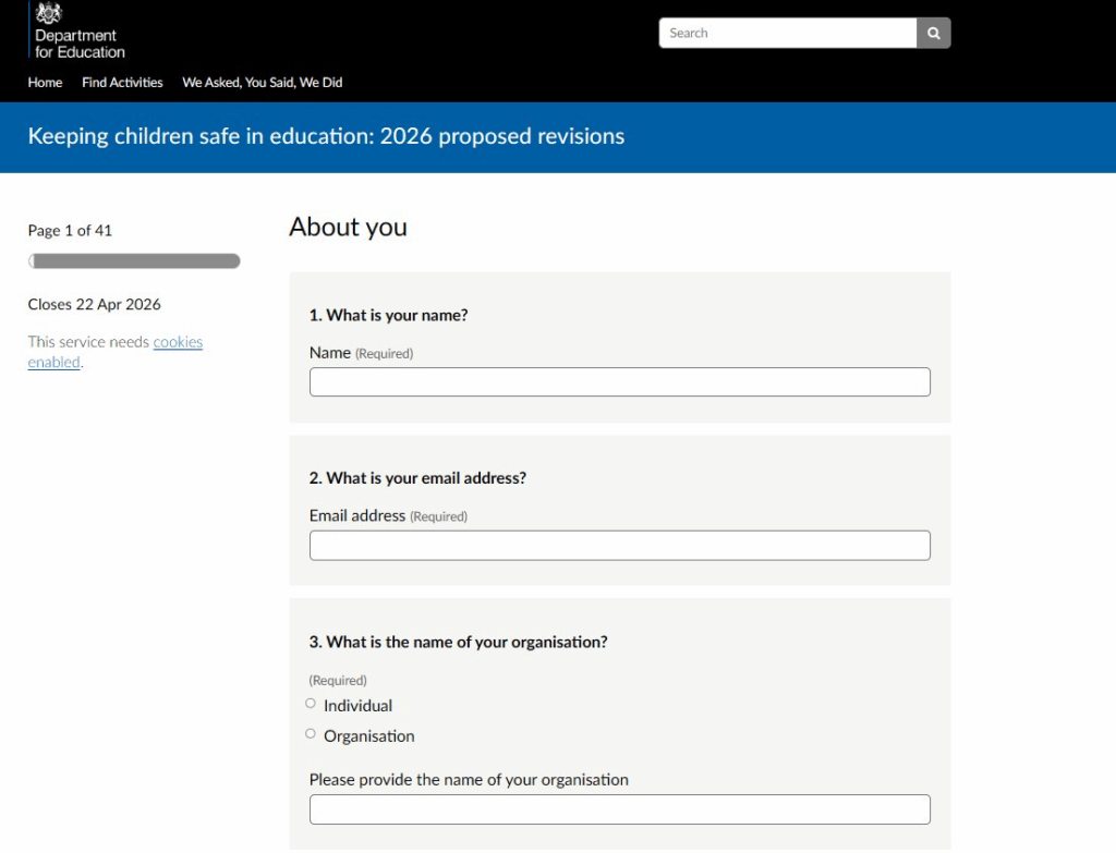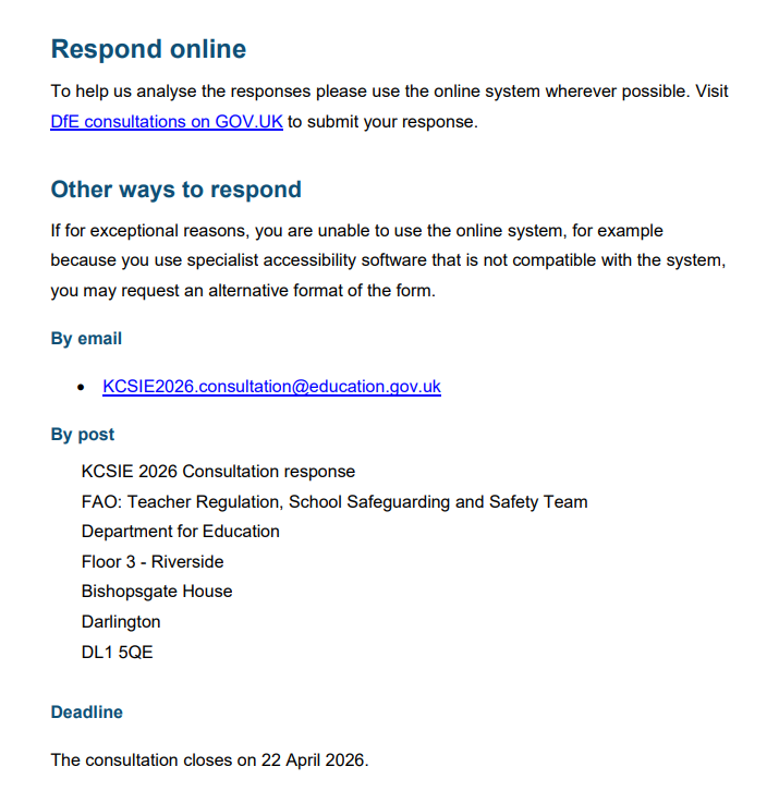Click here to Start: https://consult.education.gov.uk/independent-education-and-school-safeguarding-division/keeping-children-safe-in-education-2026-revisions/consultation/intro