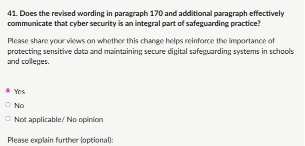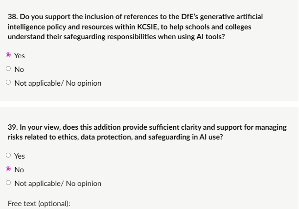 My response: “Yes, KCSIE should include specific reference to the emerging safeguarding risks associated with artificial intelligence (AI). AI is already embedded in education (teacher planning tools, pupil-facing chatbots, image generators, research assistants) and the risks to children are real, serious, and evolving rapidly in 2026. However, AI also offers legitimate educational benefits: supporting lesson planning, accessibility (e.g., text-to-speech for SEND pupils), personalised learning, research summarisation, and creative tasks when used safely and ethically. Teachers and staff must be able to discern good from harmful uses, protect children from risks, and confidently teach about both the positive potential and the dangers of AI. Many remain unaware of risks or are overly restrictive, missing opportunities to prepare children for the real world. Balanced, explicit inclusion in KCSIE (Part Two, online safety, Annex B) ensures safeguarding remains number one while allowing responsible innovation. E.g. Explicit recognition of AI-generated CSAM/deepfakes alongside education-specific AI tools for teaching critical thinking, digital literacy, and responsible technology use.”