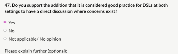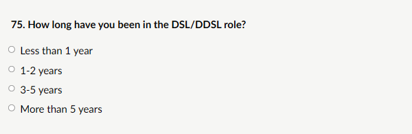 My response: “Not applicable – I am not a DSL or deputy in a school/college. I have responded to this section based on my own extensive safeguarding leadership experience in care services and as a teacher who has worked closely with DSLs. My confidence in core safeguarding principles (child-centred, evidence-based, no compromise on biological sex protections, early intervention) is high, but I recognise the unique pressures DSLs face in schools; workload, emotional toll, emerging digital threats, which the questions here aim to address. My input throughout the consultation reflects a strong external view that safeguarding must remain practical, robust, and free from ideological influence.”