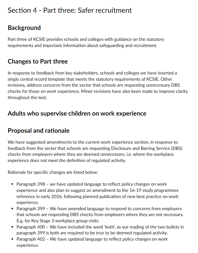 My response: “Yes, including an example single central record (SCR) template in KCSIE is very helpful. The SCR is a statutory requirement (Education Act 2002, Independent School Standards Regulations 2014, Non-Maintained Special Schools Regulations 2015) for recording pre-appointment vetting checks on all staff, supply teachers, volunteers, contractors, and others in regulated activity. Many schools/colleges struggle with format consistency, completeness, or audit readiness; especially smaller settings or those new to academisation. Suggestion for even greater value: Include guidance on digital vs paper SCRs, access controls (only authorised staff), annual audit requirements, and how to handle supply/agency staff (written confirmation from agencies). Also note retention periods.”