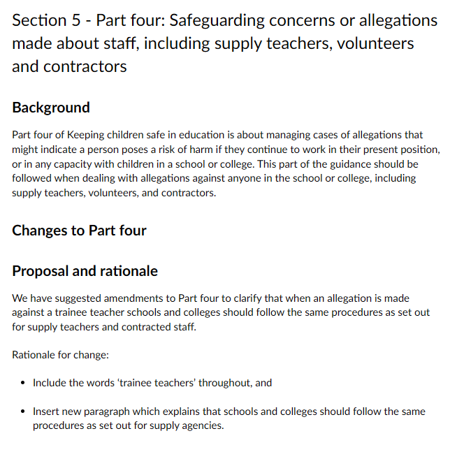 My response: “I am confident in responding to allegations against trainee teachers and understanding the roles involved. The draft KCSIE (Part four) already treats allegations against all adults working with children (including supply teachers, contractors, volunteers) under the same harm threshold and management procedures (paras 391–418 in 2025 version, with updates). The proposed addition explicitly includes “trainee teachers” throughout and inserts a new paragraph aligning procedures with those for supply/contracted staff. This removes any ambiguity: schools must follow the same steps—consider LADO referral (if harm threshold met), manage low-level concerns internally (if below threshold), involve the trainee’s provider/university for placement decisions, and ensure child safety (e.g., suspension from duties, risk assessment). Trainee teachers are not employees, so schools share responsibility with the training provider, but the school retains full safeguarding oversight on site.”