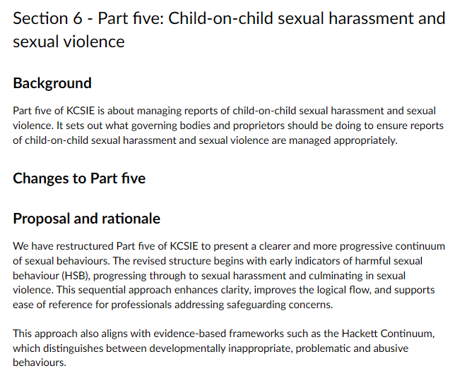 My response: “Yes, aligning with frameworks like the Hackett Continuum significantly helps schools and colleges distinguish between developmentally inappropriate, problematic, and abusive sexual behaviours. The Hackett model (widely used in multi-agency safeguarding) provides a clear developmental lens: Developmentally inappropriate: behaviours outside age-expected norms but not necessarily harmful (e.g., curiosity in very young children). Problematic: behaviours causing concern or distress but not meeting abuse thresholds (e.g., persistent boundary-pushing). Abusive: behaviours involving coercion, lack of consent, power imbalance, or harm (meeting criminal/safeguarding thresholds). The revised Part Five structure, starting with early indicators and progressing to harassment/violence, embeds this continuum explicitly. This equips staff to: Avoid over- or under-reaction; Apply proportionate responses; Recognise that children displaying HSB may need safeguarding themselves It supports accurate risk assessment, reduces inconsistency, improves outcomes for all children involved, and strengthens compliance with statutory duties.”