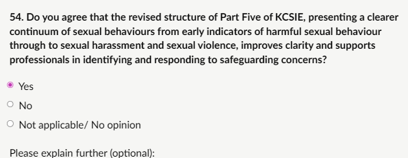 My response: “Yes, I agree that restructuring Part Five to present a clearer, progressive continuum; from early indicators of harmful sexual behaviour (HSB), through sexual harassment, to sexual violence, improves clarity and supports professionals. The sequential approach makes it easier for DSLs, teachers, and pastoral staff to locate relevant guidance quickly when behaviours escalate or are identified early. Current versions can feel disjointed; this logical flow enhances ease of reference, promotes consistent language, and encourages proactive identification of low-level concerning behaviours before they become serious incidents .This structure better supports child-centred safeguarding by emphasising early intervention, professional curiosity, and proportionate responses; key to preventing escalation and protecting both victims and children displaying HSB (who may themselves be victims of abuse or trauma). It aligns with Working Together to Safeguard Children (2023) and Ofsted expectations for robust handling of child-on-child abuse. The change is practical, evidence-informed, and strengthens overall safeguarding without adding complexity.”