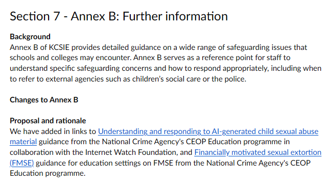 My response: “Yes, adding these two specific links to Annex B is very helpful for schools and colleges. Both are real, fast-growing dangers to children in 2026: Pupils can now use free AI tools to make fake nude images or videos of classmates (deepfakes) this is criminal CSAM and child-on-child abuse. Sextortion (FMSE) leads to victims often feeling trapped and suicidal. Both resources are from trusted national sources (NCA/CEOP, IWF), evidence-based, and tailored for education settings. Placing them in Annex B; already the go-to reference for specific issues, makes them easily accessible during training, incident response, or policy reviews. This directly supports child safeguarding in emerging digital threat areas without adding length or complexity to the main guidance. Suggestion: Consider adding a brief one-line descriptor next to each link (e.g., “for recognising and reporting AI-generated CSAM and deepfakes”) to aid quick navigation.”