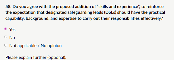 My response: “I strongly agree. Adding “skills and experience” to paragraph 125 (and reflected in Part two) is essential. The DSL role is the linchpin of safeguarding in every school/college, holding the position based only on status or seniority is not enough. Effective DSLs need: Practical experience dealing with real safeguarding cases (abuse, neglect, exploitation, mental health crises, child-on-child harm). Skills in risk assessment, multi-agency liaison (social care, police, health), record-keeping, staff support, and training delivery. Up-to-date knowledge of emerging threats (online harms, AI-generated CSAM, sextortion, serious youth violence). Ability to challenge poor practice and escalate without fear. “Skills and experience” makes clear that DSL appointment is not a tick-box role for a senior leader, it requires proven capability. This protects children by ensuring the person leading safeguarding is competent, not just available. It also supports recruitment and training planning. DSLs must have relevant safeguarding experience (ideally in child protection or similar) and demonstrable skills in case management.”