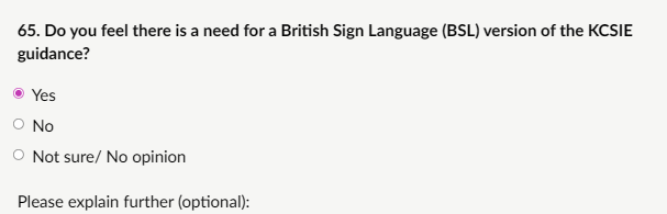 Currently KCSIE is not available in British Sign Language (BSL), we’re seeking views on whether there is a need for a BSL version to improve accessibility and equity in education settings.