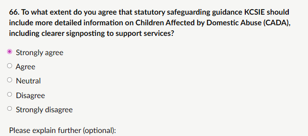 My response: “I strongly agree that KCSIE should include more detailed information on Children Affected by Domestic Abuse (CADA), with clearer signposting to support services. Domestic abuse has profound, long-term impacts on children, even when they are not directly physically harmed. Children living with domestic abuse are at significantly higher risk of emotional harm, mental health difficulties, developmental delays, behavioural issues, poor school attendance, bullying perpetration/victimisation, and future involvement in abusive relationships or criminality. Explicit language would reinforce professional curiosity, reduce victim-blaming assumptions (e.g., “the child is just naughty”), and ensure schools support both the child and the non-abusive parent safely. It aligns with statutory duties to safeguard and promote welfare (Children Act 1989) and prevents children falling through gaps. Suggestion: Add -Definition and prevalence, Impact on children, Key indicators in school, Response pathways, Clear signposting to national/local services. This would be proportionate, evidence-based, and directly enhance child protection without lengthening the document excessively.”