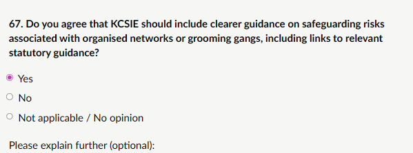 My response: “Yes, KCSIE should include clearer guidance on safeguarding risks associated with organised networks or grooming gangs, with direct links to relevant statutory guidance. Organised grooming gangs represent a serious, targeted form of child sexual exploitation involving multiple perpetrators, often exploiting vulnerabilities such as looked-after status, family breakdown, poverty, neurodiversity, or emotional neglect. Victims are groomed systematically, leading to repeated abuse, trafficking, and long-term trauma. Many cases have been under-reported or mishandled due to institutional failures. Clearer KCSIE guidance would help DSLs and staff: Recognise indicators, Understand multi-agency risks (e.g., fear of being labelled “racist” historically prevented reporting, Know when to refer to police, children’s social care, or relevant agencies. Explicit reference removes ambiguity and reinforces that child protection is paramount, regardless of perpetrator background. Guidance must explicitly state: safeguarding concerns must be raised and investigated without fear of being labelled racist or discriminatory. Child welfare comes first.”