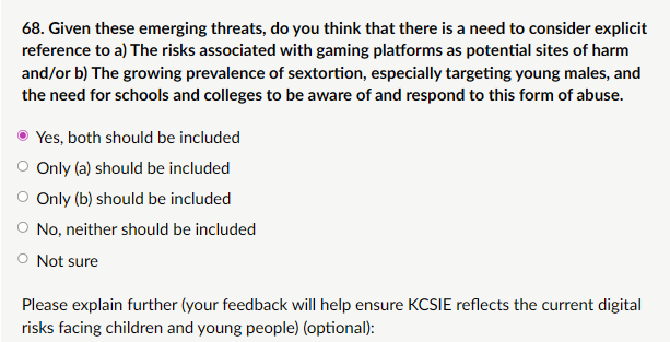 My response: “Both gaming platforms and sextortion (especially financially motivated sexual extortion) must be explicitly referenced in KCSIE as emerging digital safeguarding risks. These threats are real, growing rapidly in 2026, and disproportionately affect children and young people in education settings. Gaming platforms (e.g., Roblox, Fortnite, Minecraft, Discord-integrated games, Call of Duty, GTA Online) are increasingly used for grooming, exploitation, and contact by organised networks. Sextortion (FMSE) is surging, with young males disproportionately affected (NCA/CEOP data 2025–2026 shows boys 13–17 as primary victims). Offenders coerce explicit images via gaming, social media, or dating apps, then demand money/crypto under threat of exposure to family/peers/school. Omitting them risks schools being under-prepared. Explicit inclusion (with signposting to CEOP/NCA resources) equips staff to protect children effectively, supports early identification, and aligns with Online Safety Act duties. Neither should be left vague; both warrant clear, mandatory reference to keep safeguarding current and robust.”