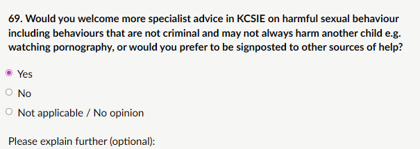 My response: “Yes, I would welcome more specialist advice in KCSIE on harmful sexual behaviour (HSB), including behaviours that are not criminal and may not always directly harm another child (e.g., compulsive watching of pornography, excessive sexualised language, or solitary sexualised play that indicates distress or vulnerability). KCSIE already covers child-on-child sexual violence/harassment well in Part Five, but guidance on non-contact or solitary HSB is limited. Watching pornography is a key example with well-documented developmental harms in children and adolescents. Compulsive or early/secretive pornography use should trigger professional curiosity; not normalisation. More specialist advice embedded in KCSIE would ensure consistent, confident responses across all settings, prevent escalation, and safeguard children from both direct and indirect harms of HSB. Signposting alone risks inconsistent application.”