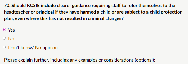 My response: “Yes, KCSIE should include clearer guidance. Safeguarding is about protecting children first; staff who have harmed a child (physically, emotionally, sexually, through neglect, or via any form of abuse) or are themselves under a child protection plan pose an unacceptable ongoing risk in any role involving children. Current guidance rightly requires colleagues to report concerns about others (Part Four, harm threshold), but it is silent or unclear on self-disclosure. This gap allows potential abusers to continue working with children undetected if no external allegation is made. The expectation should be framed as a professional duty: staff must disclose to the headteacher/principal any personal involvement in harming a child or being subject to safeguarding measures (including their own family). This strengthens safeguarding culture; transparency protects children more effectively than silence. No child should be exposed to avoidable risk because staff obligations are unclear.”