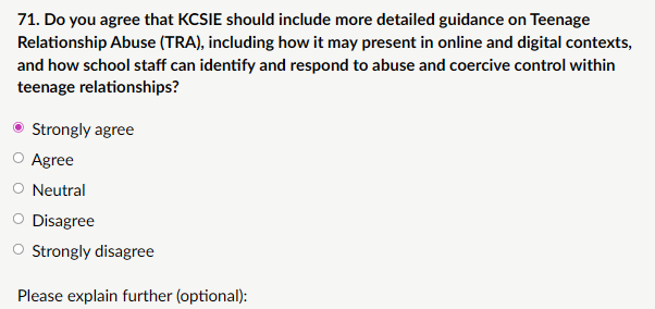 My response: “Teenage relationship abuse is widespread and rising, with recent UK data (2024–2026) showing 20–30% of young people aged 13–18 experiencing controlling, coercive, emotional, physical, or sexual abuse from a partner or ex-partner. Current KCSIE covers intra-familial domestic abuse well but is silent or limited on peer/teenage intimate partner abuse. This gap leaves staff under-equipped to recognise signs. Without explicit guidance, staff may dismiss these as “normal teenage drama” or “puppy love,” delaying intervention and allowing abuse to worsen (e.g., leading to mental health crises, school refusal, or escalation to serious violence). Stronger KCSIE guidance should cover: Definition and prevalence of TRA (including digital forms); Key indicators; How to respond, early help referrals, specialist services. Links to RSHE curriculum for prevention (healthy relationships, consent, digital boundaries); and Multi-agency pathways (police for criminal offences, social care for welfare concerns). Teenagers deserve the same protection from intimate partner abuse as adults.”