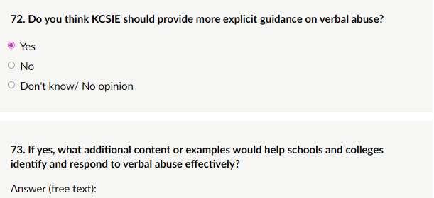 My response: “KCSIE should provide more explicit guidance on verbal abuse as a distinct safeguarding concern, ideally within the emotional abuse section or as a standalone indicator in Annex B or Part One. Additional content/examples that would help: Clear definition: Verbal abuse includes repeated shouting, swearing, threats (“I’ll kill you if you tell”), humiliation (“you’re worthless/stupid/ugly”), ridicule of appearance/disability/achievements, or coercive language (“you’ll do what I say or else”). Other examples: Intra-familial examples: Parent repeatedly calling child “useless”, “fat”, “slut”, or threatening abandonment/harm. Teenage relationship abuse (TRA) link: Partner using verbal abuse online/offline (constant criticism, threats to share images, “no one else will want you”, isolating from friends via derogatory remarks). (Plus others). Explicit guidance would prevent minimisation (“it’s just words”), encourage early intervention, and reinforce that verbal abuse is abuse, not discipline or “tough love”. It aligns with Working Together and protects children from invisible but devastating harm.”