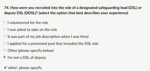 My response: “I am a teacher with many years of experience, including managerial roles in safeguarding and care services for vulnerable children and young people (residential and community settings). While I have led safeguarding processes, held deputy-level responsibilities in care environments, and contributed to multi-agency safeguarding work, I have never held the formal designated safeguarding lead (DSL) or deputy DSL role in a school or college setting. I am responding to this section from that perspective as someone with direct safeguarding leadership experience outside the KCSIE-defined DSL framework.”